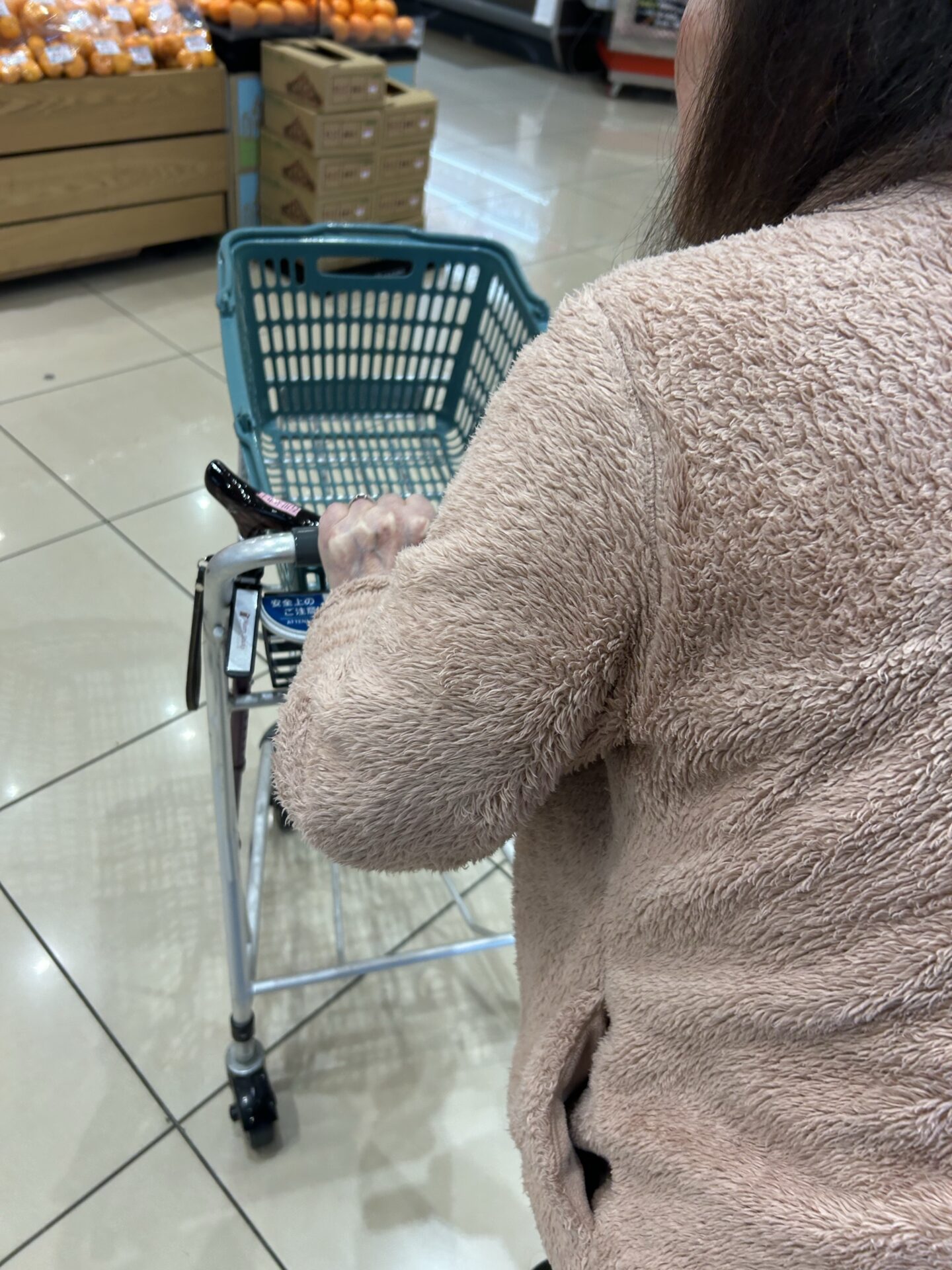 リハビリ以外では車いす介助で移動しながらの買い物ですが、リハビリを兼ねてカート歩行での移動です